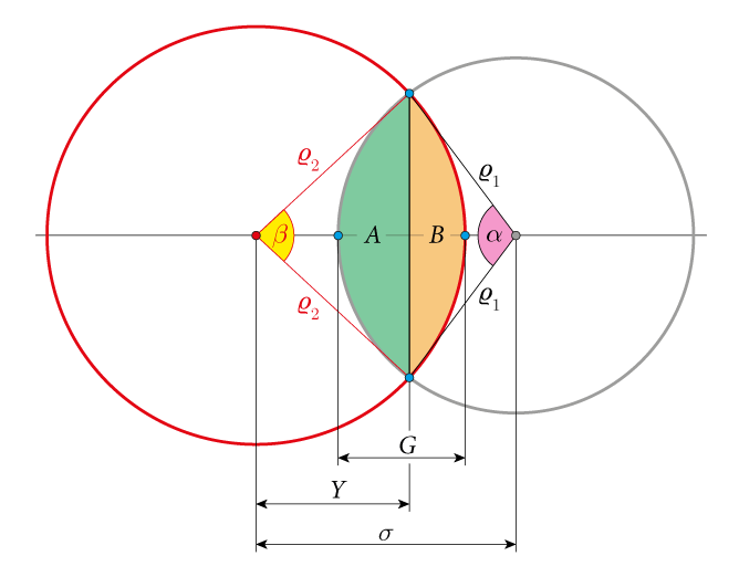 \[\begin{split} A &= \frac{\varrho_1^2}{2}\cdot \left(\frac{\pi}{180^{\circ}}\cdot\alpha - \sin(\alpha)\right) \\[2ex] B &= \frac{\varrho_2^2}{2}\cdot \left(\frac{\pi}{180^{\circ}}\cdot\beta - \sin(\beta)\right) \\[2ex] O &= \frac{A + B}{\pi\cdot\varrho_k^2} \end{split}\tag{66}\]
