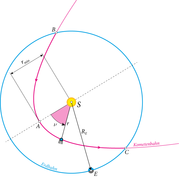 Der Perihel des Kometen hat den halben Erdabstand (Erinnerung: Erdbahn sei kreisförmig). Damit braucht man $r_{min}$ nur noch in Gleichung (9) einzusetzen und man erhält die Lösung mit $G$, $R_E$ und $M_{\odot}$: