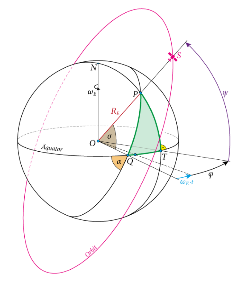 Der projizierte Punkt $P$ wird eine bestimmte Bewegung auf der Erdoberfläche ausführen, die durch den Zusammenhang zwischen der geografischen Länge $\varphi (t)$ und der geografischen Breite $\psi (t)$ angegeben werden kann. Aus dem orthogonalen sphärischen Dreieck $\bigtriangleup QTP$ kann man mit dem Erdradius $R_E$ sowie der Winkelgeschwindigkeit $\omega_{E}$ der Erde folgern: